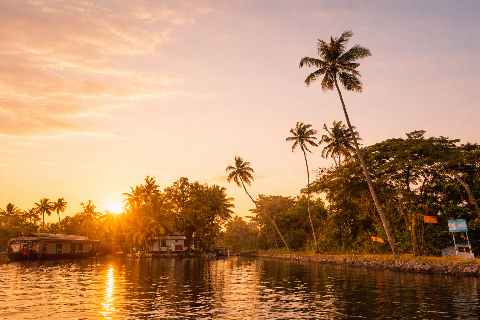 Alleppey: Warm tropical weather (approx. 24–32°C / 75–90°F) with gentle humidity and glowing sunsets over the backwaters