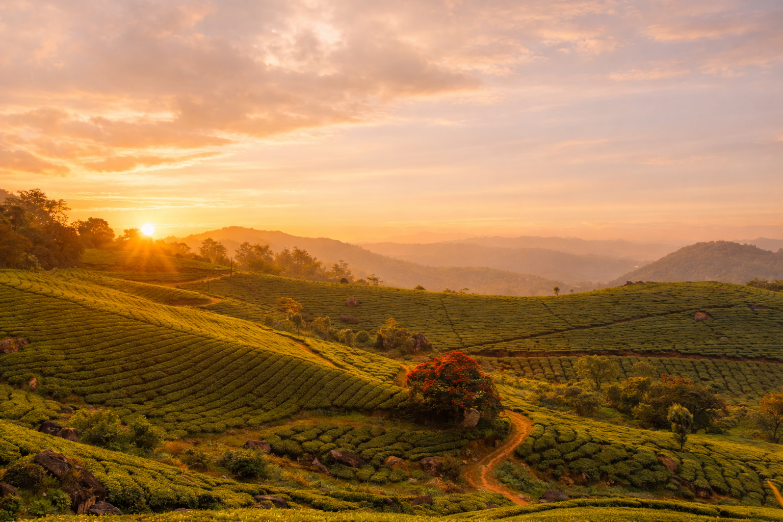 Misty mornings in Munnar’s tea hills paired with glowing sunsets over Alleppey’s backwaters and Kochi’s coast