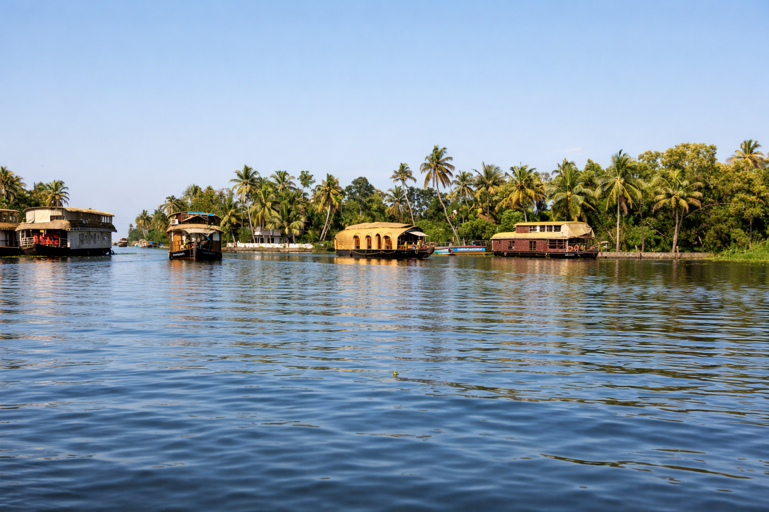 Alleppey: Warm tropical weather (approx. 24–32°C / 75–90°F) with gentle humidity and glowing sunsets over the backwaters